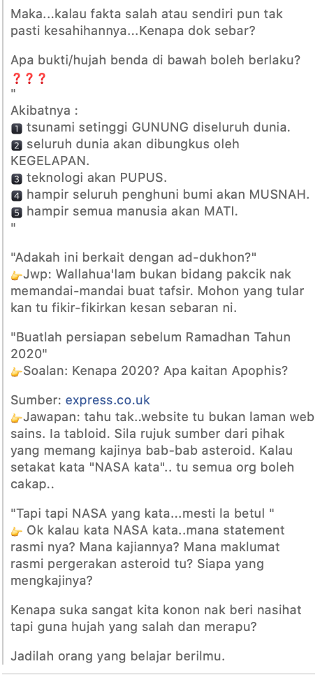 Penceramah perlu berhati-hati dalam berinteraksi dengan hadith. Apatah lagi hadith fitan dan eskatologi yang boleh mengundang kerungsingan dalam kalangan umat Islam. Sebaliknya, penceramah perlu mendidik umat Islam supaya meningkatkan amal ibadah agar sentiasa bersedia menghadapi hari kematian dan akhirat, tanpa perlu mengaitkan ia dengan maklumat palsu seperti kononnya dakwaan maklumat ‘sulit’ daripada NASA, dan seumpamanya.