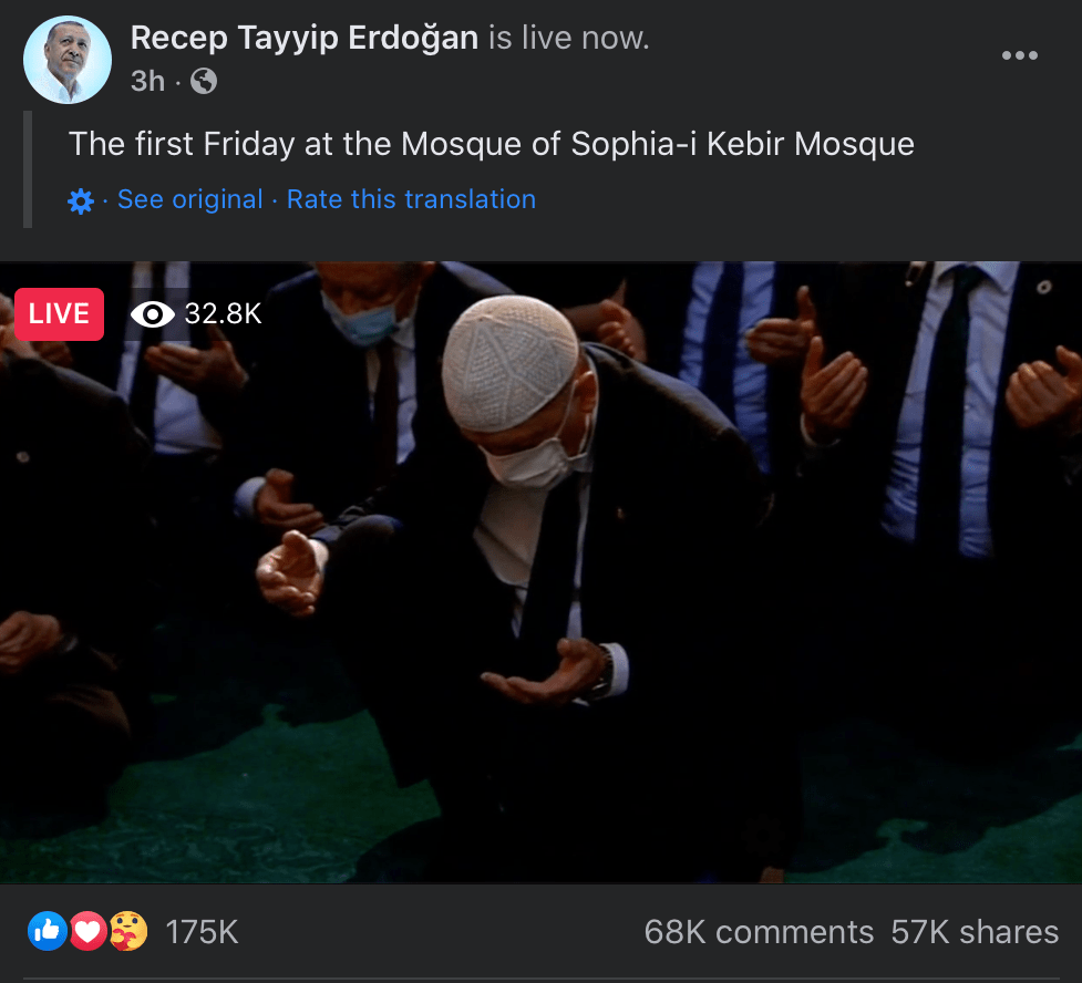 Salam untuk semua saudara dan saudari kita di seluruh pelosok dunia yang telah lama merindui dan meraikan dengan gembira sekali dengan pembukaan Hagia Sophia untuk kembali beribadah.